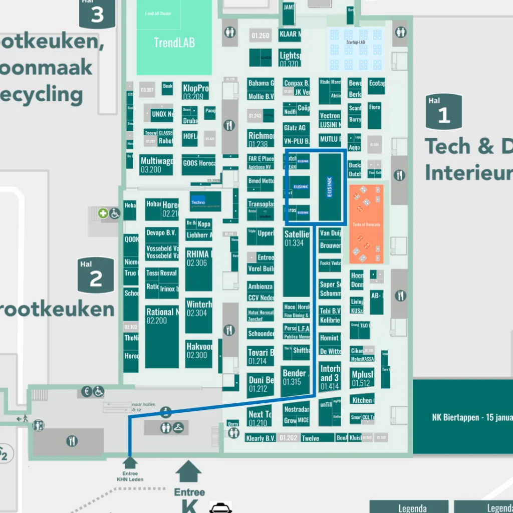 Wist je dat Eijsink 470 m² heeft ingericht om horecaondernemers verder te helpen? Op onze stand staat een groot team van adviseurs en consultants klaar om met je mee te denken. Onder andere Wilfried, Anouk en Martijn sparren graag met je over slimmer en efficiënter werken in 2026. Loop binnen voor koffie, een gerechtje in ons restaurant en een goed gesprek. Je vindt ons op stand 1.343 in hal 1. Bekijk de plattegrond hiernaast voor de makkelijkste route.